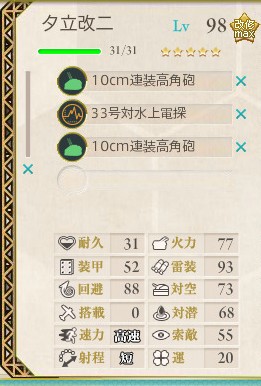 最後の分岐の索敵値は装備分を重く見るという情報があるので電探を装備。