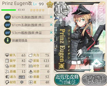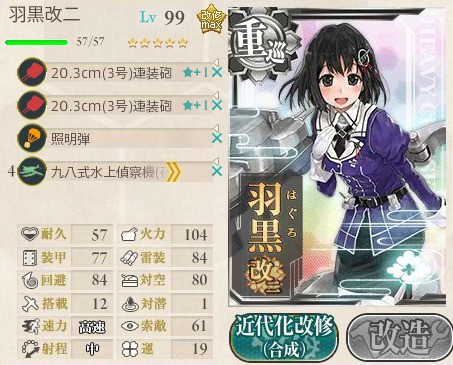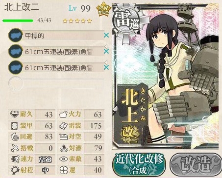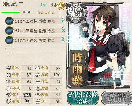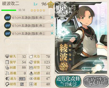 魚雷3つで夜戦キャップ付近に届くことから発動率上乗せを狙って熟練見張員を装備させていますが、更に魚雷を積むとか、夜戦装備を装備させるというのもありでしょう。
