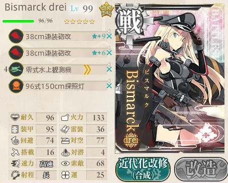 5隻目には高速戦艦枠として夜戦火力の高いBismarck dreiを採用しました。
