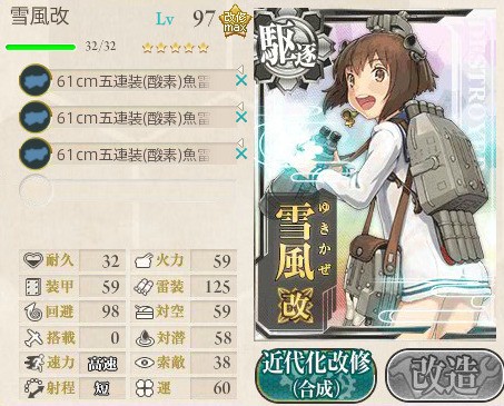 運にやや不安を残しますが、雪風よりは夜戦攻撃力が高いです。