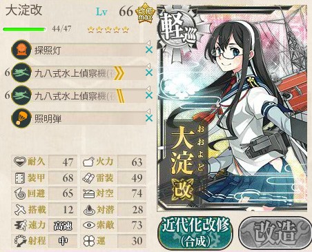 Bismarck dreiの装備変更にあわせて大淀改を夜戦装備要員とする案です。