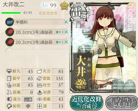 現状3隻いますが、特徴としては運の高めな北上、運が普通な大井、夜戦火力が重巡とそんなに変わらない木曾です。