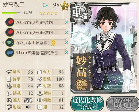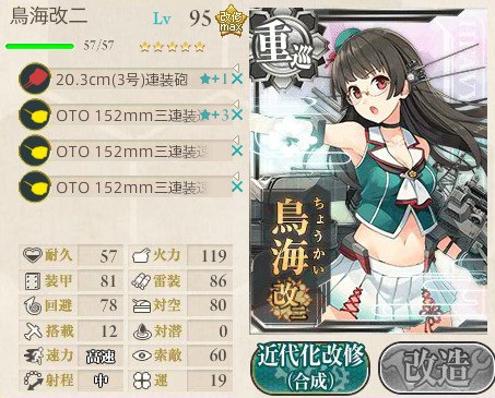 自分は砲の改修が進んでいないのであれですが、鳥海だと仮に改修が完璧であれば260*2と雷巡に及ぼうかというかなりの火力が出ることになります。