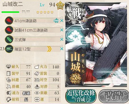 上記編成は夜戦では強いでしょうが、少々昼戦を軽視しています。そのあたりを踏まえた上で変更案を考えて見ましょう