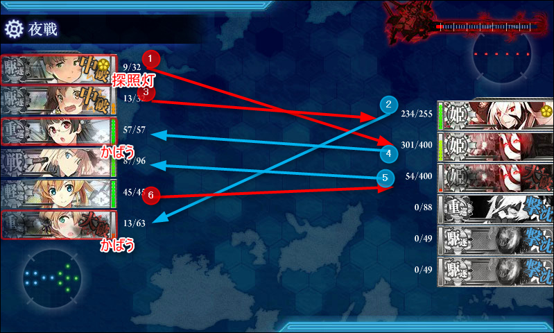 砲撃戦と違い自軍旗艦→敵軍旗艦→自軍2隻目→敵軍2隻目→自軍3隻目→敵軍3隻目→自軍4隻目→敵軍4隻目→自軍5隻目→敵軍5隻目→自軍6隻目→敵軍6隻目と交互に攻撃します。