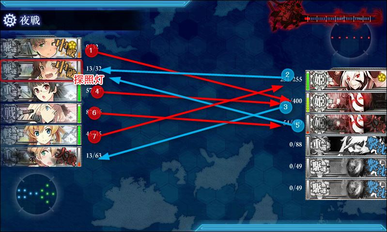 この時大破している艦、撃沈している艦、敵flagship級以上以外の空母は夜戦攻撃に参加できません。