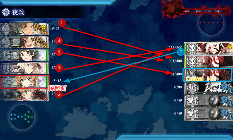 代表して神通の画像を使っていますが、神通クラスの火力雷装ですとクリティカルで十分なダメージを出すことがあります。