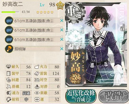 妙高は五連装酸素魚雷だと3つで夜戦キャップに到達できるため、残りのスロットは照明弾を採用しました。