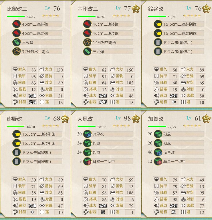 ドラム缶2、連撃構成を達成できる航巡を2隻運用して夜戦に備えましたが出番がなかったのでドラム缶4を1隻でも良いかもしれません。