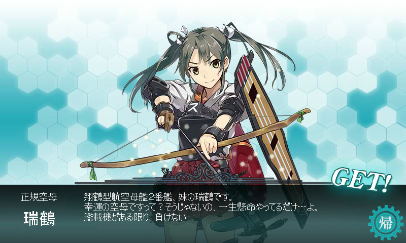 あれから大型建造を一回(3500/3500/6000/6000/20)試したところ、瑞鶴も出ました。