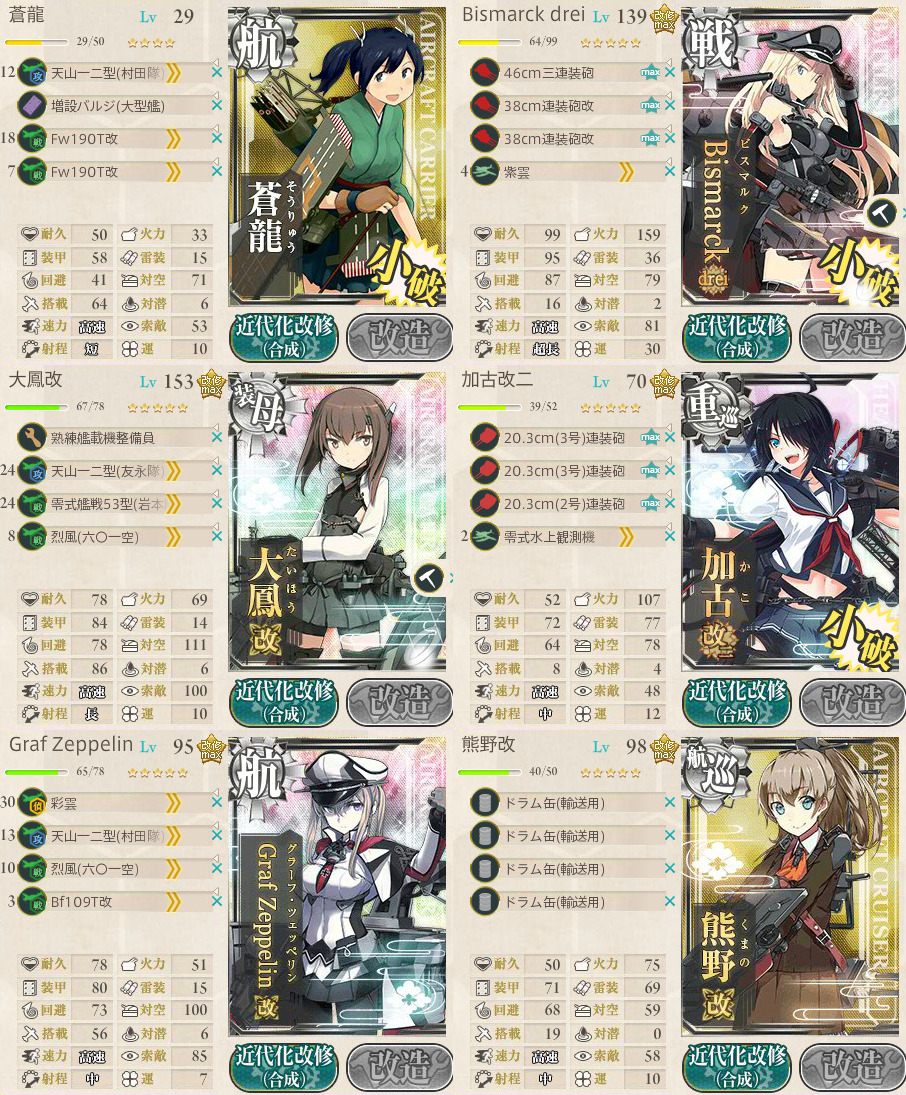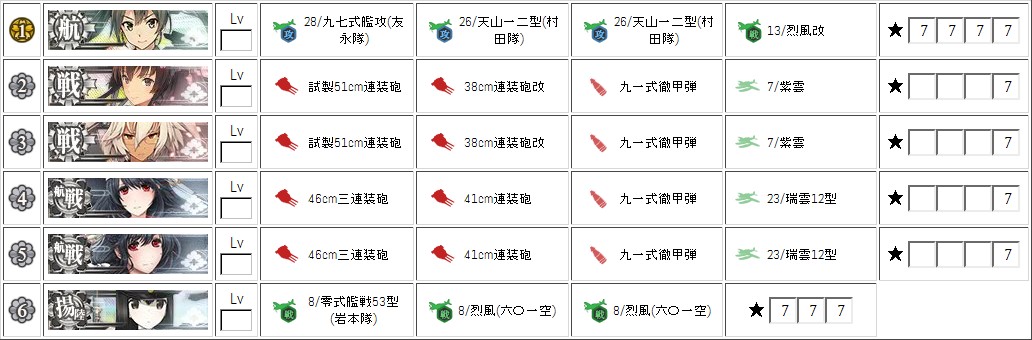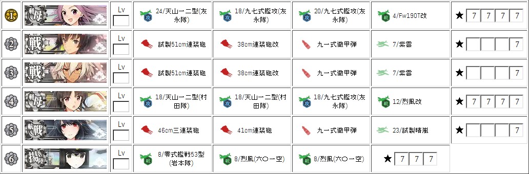 烈風改所持、烈風六〇一二つ所持、紫雲二つ所持、大和型両方所持、瑞鶴改二運用……