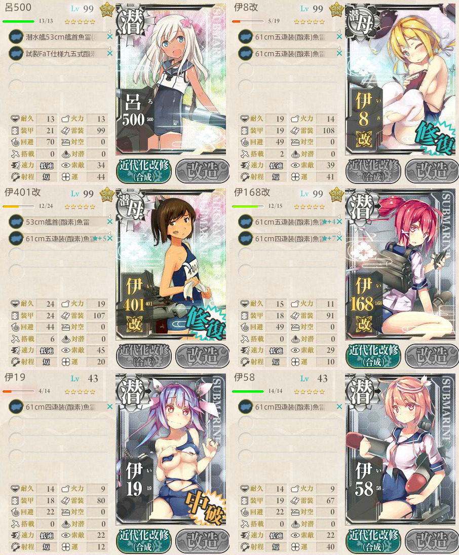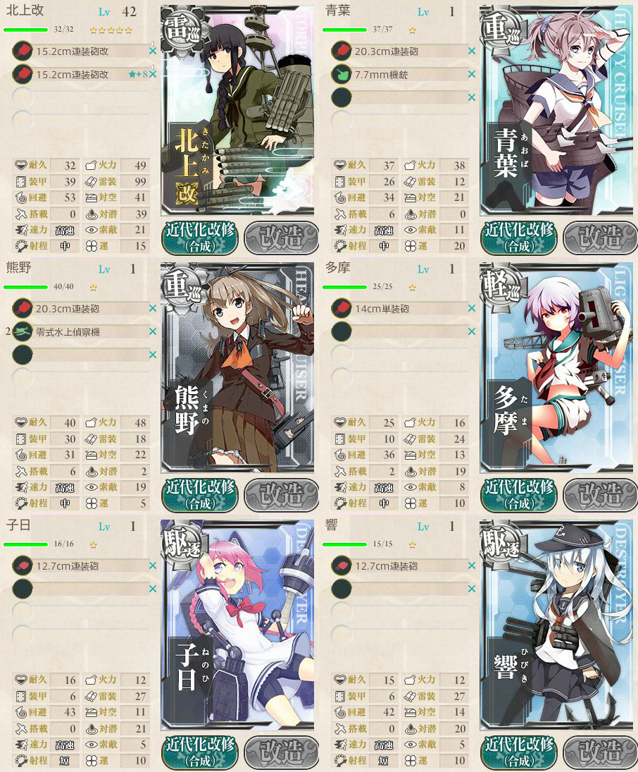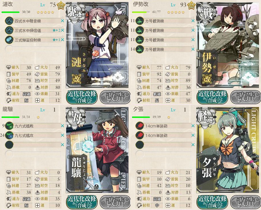火力=夜戦火力なので本来は画像みたいに装備を甘えず更にしっかり改修したものを装備させたいところです。