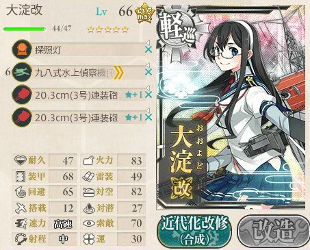 高難易度海域での基本的な装備構成は主砲+主砲+夜偵のような形が多いが連撃火力は軽巡ながら妙高型クラスのものがある。