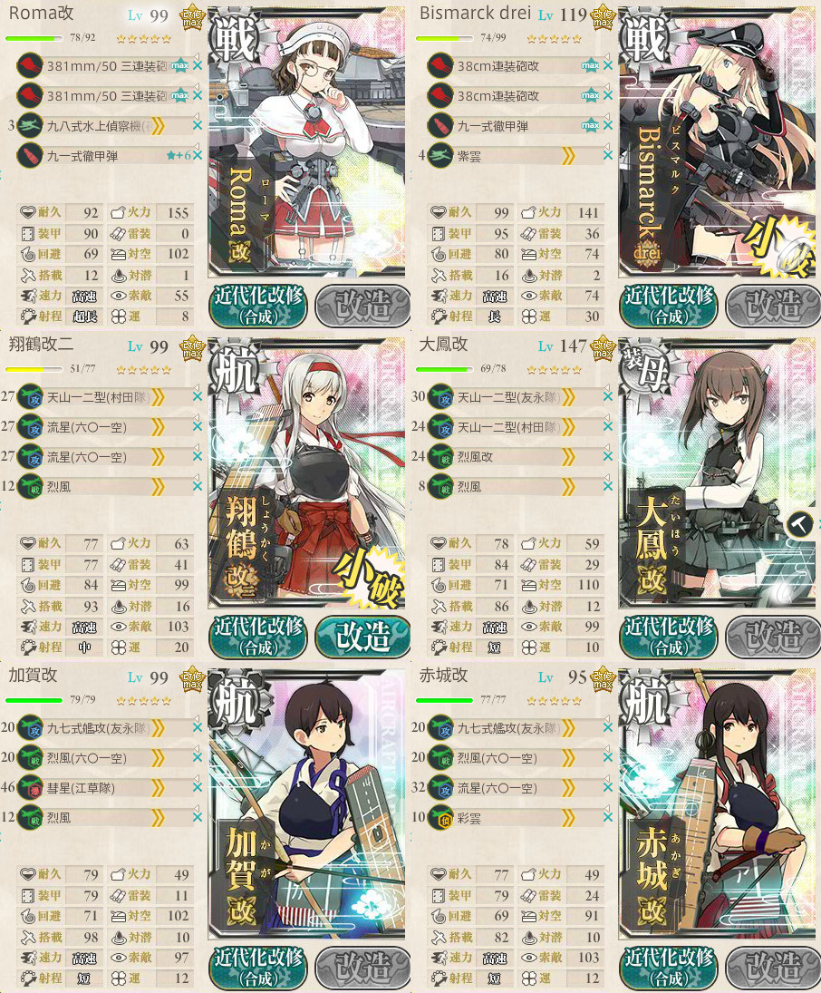 高速戦艦として非常に強力なステータスを持つものの、第二艦隊ではBismarckが優先されるし、金剛型もそれなりに強いためやや優先度は落ちるイメージ。