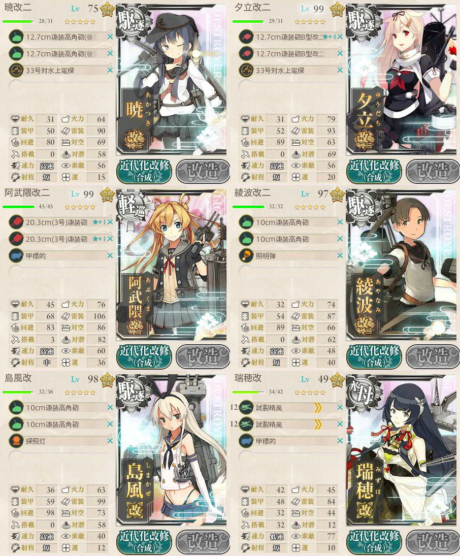 暁改二(火力62+雷装90)※★9+★4+★4夕立改二(火力73+雷装93)※魚雷2本 ★9+★4