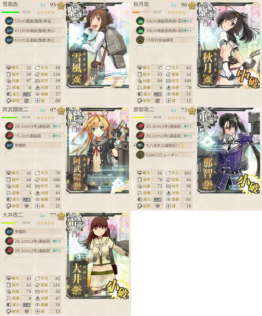 また、道中の安定感を増すために対空カットインの強い秋月、先制雷撃が可能な大井、阿武隈改二を採用しました。