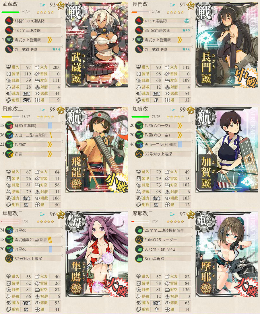 武蔵を旗艦に採用することで真っ先に殴らせ、道中突破率および行動回数を確保した。