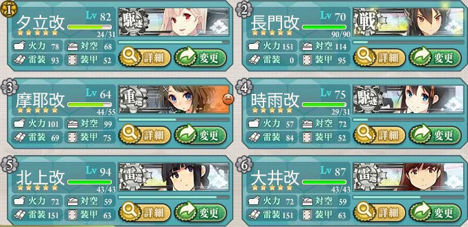 並び順は脆い連撃構成の駆逐艦を旗艦にし、次に火力の高く潜水艦を攻撃しない戦艦、重巡と並べて次に対潜特化の駆逐艦です。