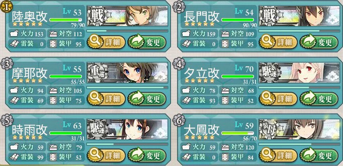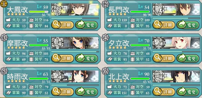 最初は雷巡の枠も空母だったのですが、制空権を取っても平気で開幕大破が起きるのと夜戦でボスを倒しきれない回があったのでやめました。