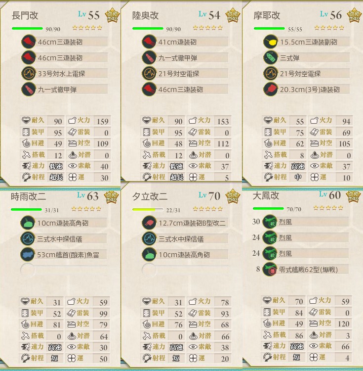 戦艦と重巡は連撃でボスを落とせるように、あとは良い電探等がないので適当に埋めました。