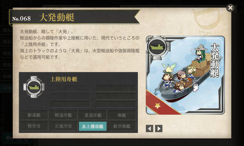 大発動艇4つだと250回、10000分(=166.6666…時間)程の量をこなすと大鳳レシピをプラスで1回やれます。