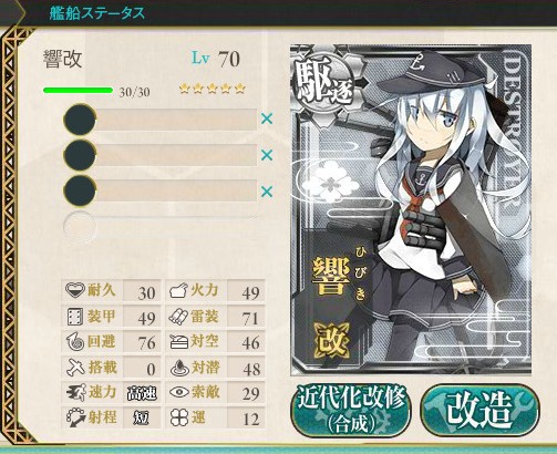 改二と言えばのんびり育てていた響がようやく70に到達しました。